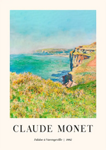 Dit schilderij van Claude Monet, "Valaise a Varengeville", toont een kusttafereel met kliffen begroeid met gras, omringd door blauw oceaanwater.
