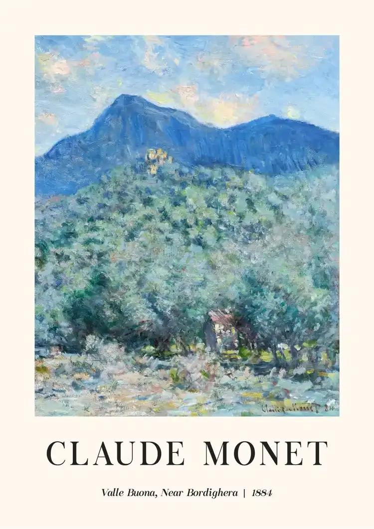 Dit schilderij, een impressionistisch werk van Claude Monet genaamd "Valle Buona, Near Bordighera", toont een adembenemend berglandschap met weelderig groen en bomen onder een bewolkte hemel.