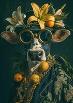 Op dit schilderij zie je een koe die volledig gestyled is, met een bloemenhoed met witte en gele lelies, ronde zonnebrillen en sieraden gemaakt van gouden kralen en sinaasappels. Het bladerkleed draagt bij aan de decoratieve, speelse uitstraling.