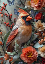 Op dit schilderij zie je een gedetailleerd sculptuur van een kleurrijke kardinaalvogel, te midden van levendige bloemen en bladeren. Met een feloranje snavel en prachtig verenontwerp, en vlinders en bessen op de achtergrond.