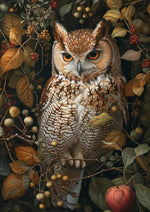 Op dit schilderij zie je een gedetailleerde afbeelding van een uil met opvallende oranje ogen en veren met patronen, te midden van herfstbladeren, bessen en kleine vruchten. De uil zit tussen het gebladerte, naadloos samensmeltend met de natuurlijke achtergrond.