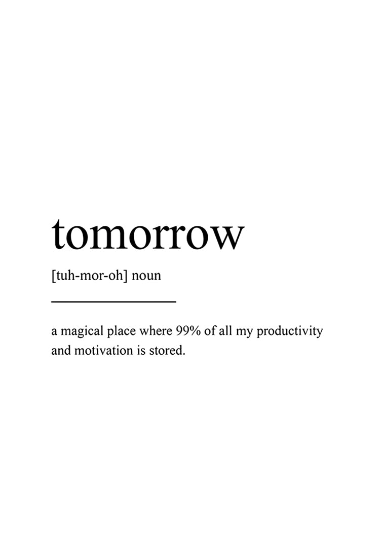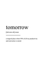 Een zwart-wit schilderij met het woord 'tomorrow' gepresenteerd in een eenvoudig zwart lettertype op een witte achtergrond.