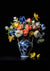 Dit schilderij toont een porseleinen vaas met een blauw-wit bloemdessin met een arrangement van kleurrijke bloemen, waaronder gele tulpen, roze rozen, witte pioenrozen en blauwe irissen tegen een zwarte achtergrond.