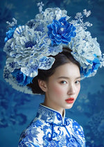 Dit schilderij toont een vrouw met een grote bloemenkroon met een passende blousje met de typische kleuren van Delfts Blauw op een mooi blauw achtergrond.