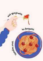 Dit schilderij toont een hand die spaghetti ronddraait op een vork boven een bord vol spaghetti en gehaktballetjes, met daarin de speelse zin 'Eat spaghetti, your regretti, to forgetti'.