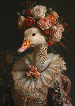 Op dit schilderij zie je een digitale afbeelding van een gans gehuld in een elegante vintage outfit. Met een kraag vol ruches, verfraaid met kant en borduurwerk, en een bloemenhoofddeksel van rozen en andere bloemen, straalt de gans een charmante en verfijnde stijl uit.