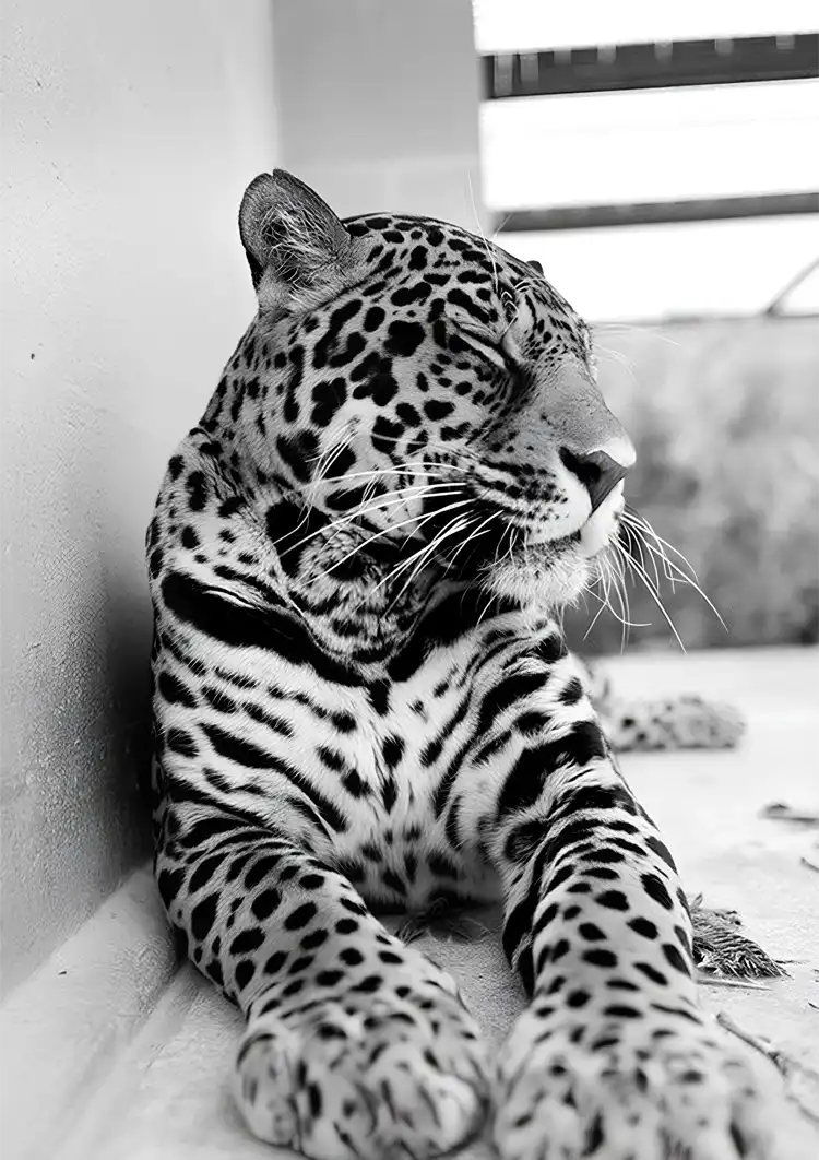 Een close-up zwart-wit schilderij van een luipaard die tegen een muur rust, met zijn kop iets naar de zijkant gedraaid, waardoor zijn gestippelde vacht en opvallende gelaatstrekken goed zichtbaar zijn.