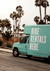 Dit schilderij toont een blauwgroene bestelwagen met "Bike Rentals Here" in vetgedrukte witte letters geparkeerd op een weg, met hoge palmbomen op de achtergrond onder een bewolkte hemel.