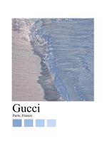 Schilderij van een golf op een zandstrand, met daaronder de teksten Gucci, Paris, Frankrijk.