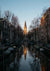 Dit schilderij toont een serene schemering van een gracht in Amsterdam.