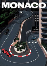 Dit schilderij toont een illustratieve beeld van de Grand Prix van Monaco, met raceauto's op een bochtig circuit.