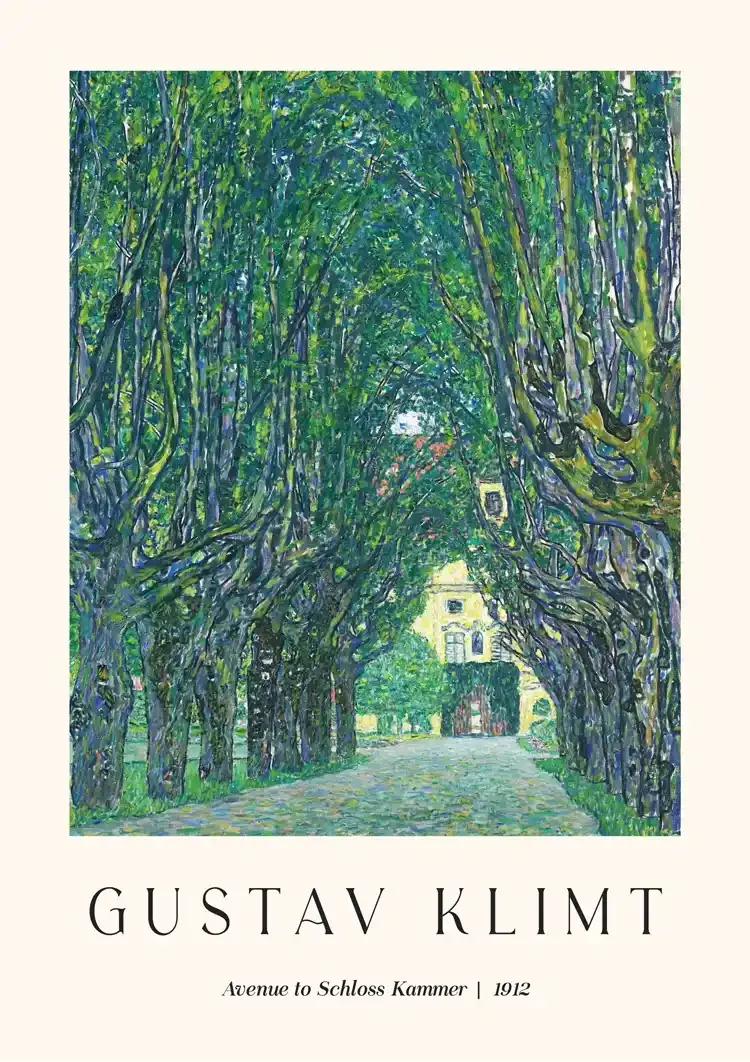 Dit schilderij, "Avenue to Schloss Kammer" van Gustav Klimt uit 1912, geeft een schilderachtig beeld van een pad geflankeerd door bomen die leiden naar een gedeeltelijk zichtbaar gebouw aan het einde. De bogen van de boomtoppen vormen een rustgevend bladerdak boven het pad.