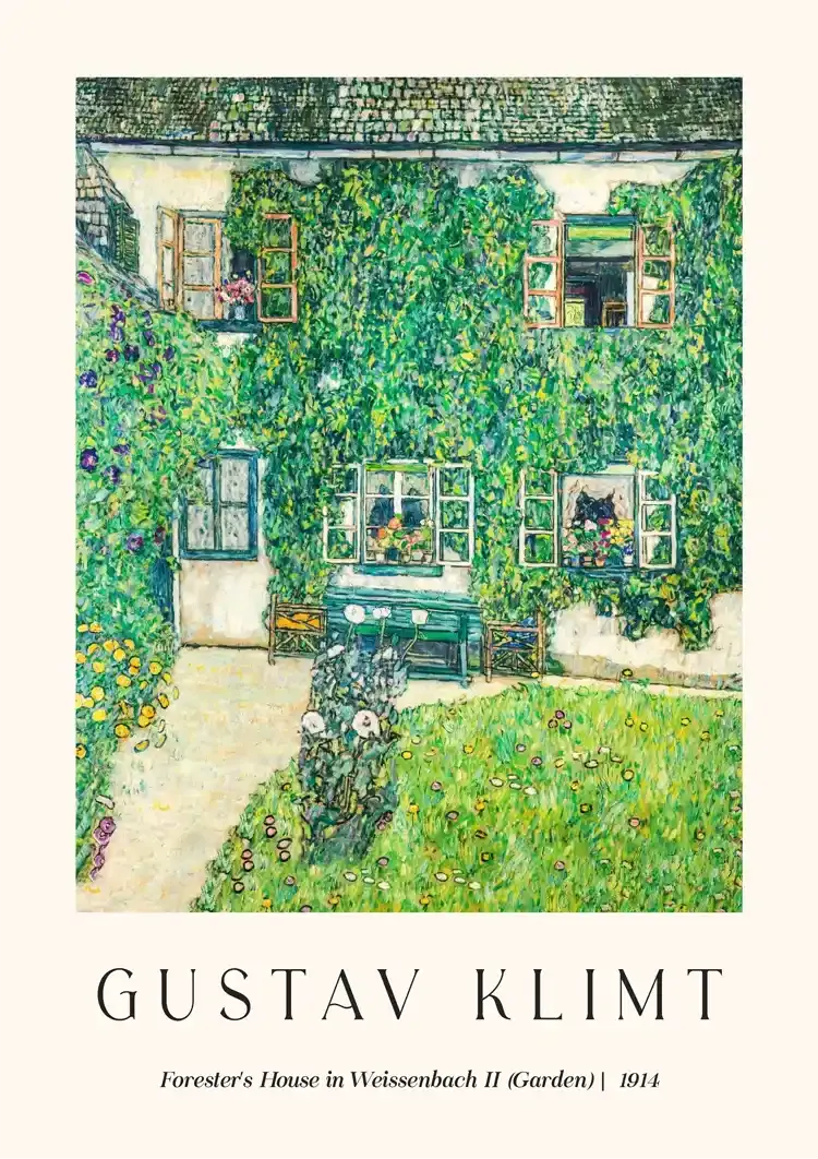 Dit schilderij van Gustav Klimt uit 1914, genaamd "Forester's House in Weissenbach II (Garden)", laat een huis zien omgeven door weelderig groen en bloemen in de tuin. Een houten bank staat tegen de muur, terwijl meerdere ramen open staan, waardoor het huis een uitnodigend gevoel krijgt.