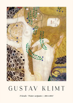 Dit kunstwerk van Gustav Klimt, getiteld "Friends Water Serpents", geschilderd tussen 1904-1907, toont twee vrouwelijke figuren met decoratieve patronen en golvend haar, in een gedetailleerde en kleurrijke compositie.