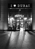 Een zwart-wit schilderij van de ingang van een winkel met een bord "I ♥ DUBAI" erboven. Dit kunstwerk is de perfecte wanddecoratie om jouw ruimte tot leven te brengen. Elk schilderij wordt met zorg en oog voor detail gemaakt, zodat je verzekerd bent van de hoogste kwaliteit en een prachtig eindresultaat.