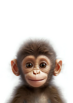Dit schilderij vangt een intieme close-up van een jonge aap met grote, expressieve ogen en een lichte glimlach op zijn gezicht. Tegen een effen witte achtergrond komen de gelaatstrekken van de aap prachtig naar voren.