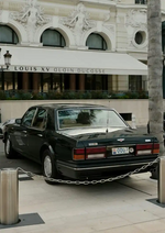 Een klassieke donkergroene Bentley geparkeerd buiten het chique Louis XV-restaurant Alain Ducasse, met de gevel zichtbaar op de achtergrond, en de auto aan de achterkant vastgeketend aan een paal.