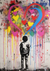 Dit schilderij toont een klein kind van achteren, kijkend naar een groot blauw en rood hart omringd door kleinere gele harten, allemaal druipende verf.