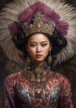Dit schilderij toont een persoon met een sierlijke hoofdtooi met grote veren en ingewikkelde sieraden, gekleed in een uitbundig versierd kledingstuk met gedetailleerde patronen en accessoires, wat een koninklijke en traditionele uitstraling geeft.
