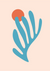 Dit abstracte schilderij toont een blauw koraal met een rode cirkel op een lichtroze achtergrond, dat lijkt op mariene flora. Het heeft een golvende vorm met vijf takken.