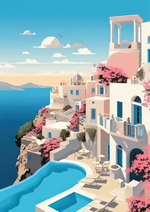 Dit schilderij vangt de charme van een idyllisch kuststadje, met witte gebouwen en roze bougainville, balkons die uitkijken op de zee onder een stralend blauwe lucht. Het ademt een sfeer van rust en schoonheid uit.