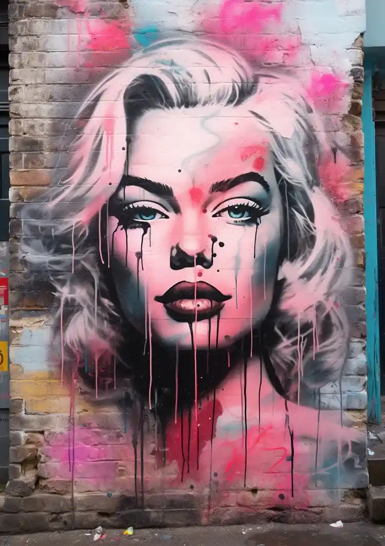 Dit schilderij toont een levendige vrouw met opvallende ogen en volle lippen, uitgevoerd in roze, zwart en wit.