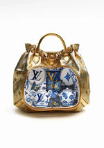 Een goudkleurige handtas met een transparant voorvak met daarin blauwe en witte porseleinen schaaltjes met een bloemmotief en LV-logo's. De tas heeft een trekkoordsluiting en een hengsel aan de bovenzijde.