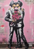 Dit schilderij toont twee kussende mannen in pak, een met een boeket roze bloemen in de hand.