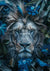 Dit schilderij toont het gezicht van een leeuw, omringd door blauwe bloemen en bladeren, terwijl kleine blauwe vogels op de planten zitten. De kalme uitdrukking van de leeuw kijkt de toeschouwer rechtstreeks aan, waardoor een sereen en majestueus moment in de natuur wordt vastgelegd.