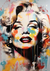 Dit is een schilderij van Marilyn Monroe met levendige verfspatten en druipende effecten op een witte achtergrond.