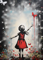 Dit schilderij toont een meisje in een rode jurk die naar een vlinder reikt met verfspatten om zich heen.