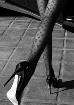 Een zwart-wit schilderij van vrouwelijke benen in een panty met patronen, met daaronder modieuze laarzen.