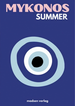 Dit schilderij vangt de zomerse sfeer met de titel "Mykonos Summer" in stralend witte letters op een diepblauwe achtergrond, vergezeld van een abstract ontwerp dat de verbeelding prikkelt.
