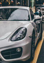 Dit schilderij toont een close-up van een Nardo grey Porsche 718 geparkeerd in een drukke straat, met duidelijke details van het strakke ontwerp en de ronde koplampen. De achtergrond toont wazig stadsverkeer.