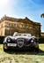 Dit schilderij toont een vintage paarse MF4 sportwagen geparkeerd voor een groot stenen herenhuis onder een heldere hemel.