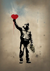 Dit schilderij toont een graffitikunstwerk in stencilstijl met een persoon met een kap die een ballon in de ene hand houdt.