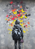 Dit schilderij toont een persoon van achteren, die een rugzak draagt en naar boven kijkt naar een uitbarsting van kleurrijke vlinders in de kleuren rood, oranje, geel en roze.