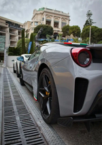 Dit schilderij toont een Ferrari 488 Pista geparkeerd in een natte straat voor een sierlijk gebouw met weelderig groen en wolkenluchten erboven. Op de achterkant zie je een subtiel gemarkeerde Italiaanse vlag op de auto.