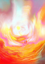 Twee mensen wandelen richting een felle, hemelse lichtopening in een abstract, warm kleurenspel.