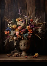 Op dit schilderij prijkt een weelderig arrangement van droogbloemen in roze, rood, geel, blauw en paars, tegen een donkere houten achtergrond. Enkele gedroogde bloemen en bladeren liggen verspreid aan de voet van de vaas.