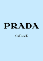 Een schilderij met de tekst Prada Catwalk op een lichtblauwe achtergrond.