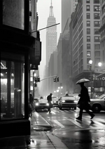 Een schilderij op een regenachtige dag, mensen met een paraplu en auto's op de achtergrond.