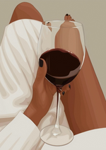 Dit schilderij vangt het moment van ontspanning perfect, met een elegante illustratie van iemand die een glas rode wijn vasthoudt. De focus ligt op het glas, terwijl de persoon comfortabel onder een deken ligt, met blote voeten zichtbaar.