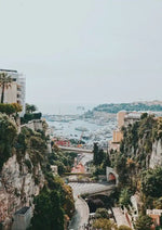 Dit schilderij toont een kustlandschap met gebouwen, een kronkelweg die door een rotsachtig landschap snijdt en een haven vol boten.