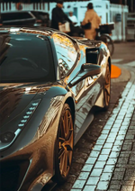 Dit schilderij toont een close-up van de zijkant van een Ferrari 488, die geparkeerd staat in een straat.