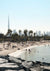 Dit schilderij toont een strand met mensen en palmbomen, met uitzicht op de skyline van Dubai.