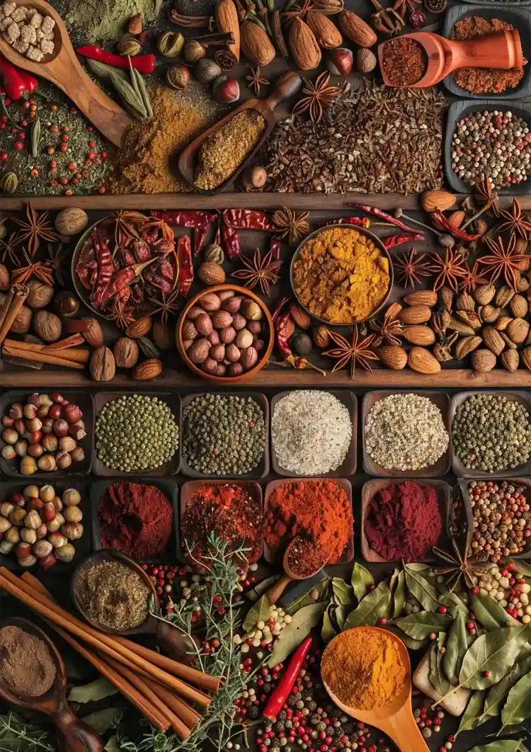 Dit schilderij toont een verscheidenheid aan specerijen en kruiden in vierkante en ronde containers op een houten oppervlak, waaronder kaneelstokjes, peperkorrels en laurierblaadjes.