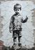 Dit schilderij toont straatkunst van een jonge jongen in een jasje, gemaakt in zwart-wit met een verbrijzelde achtergrond op een muur.
