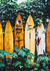 Een schilderij met een muur vol met bladeren met daartegen een aantal surfborden.