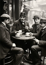 Een zwart-wit schilderij van mannen rondom een tafel. Samen met een bakje koffie.